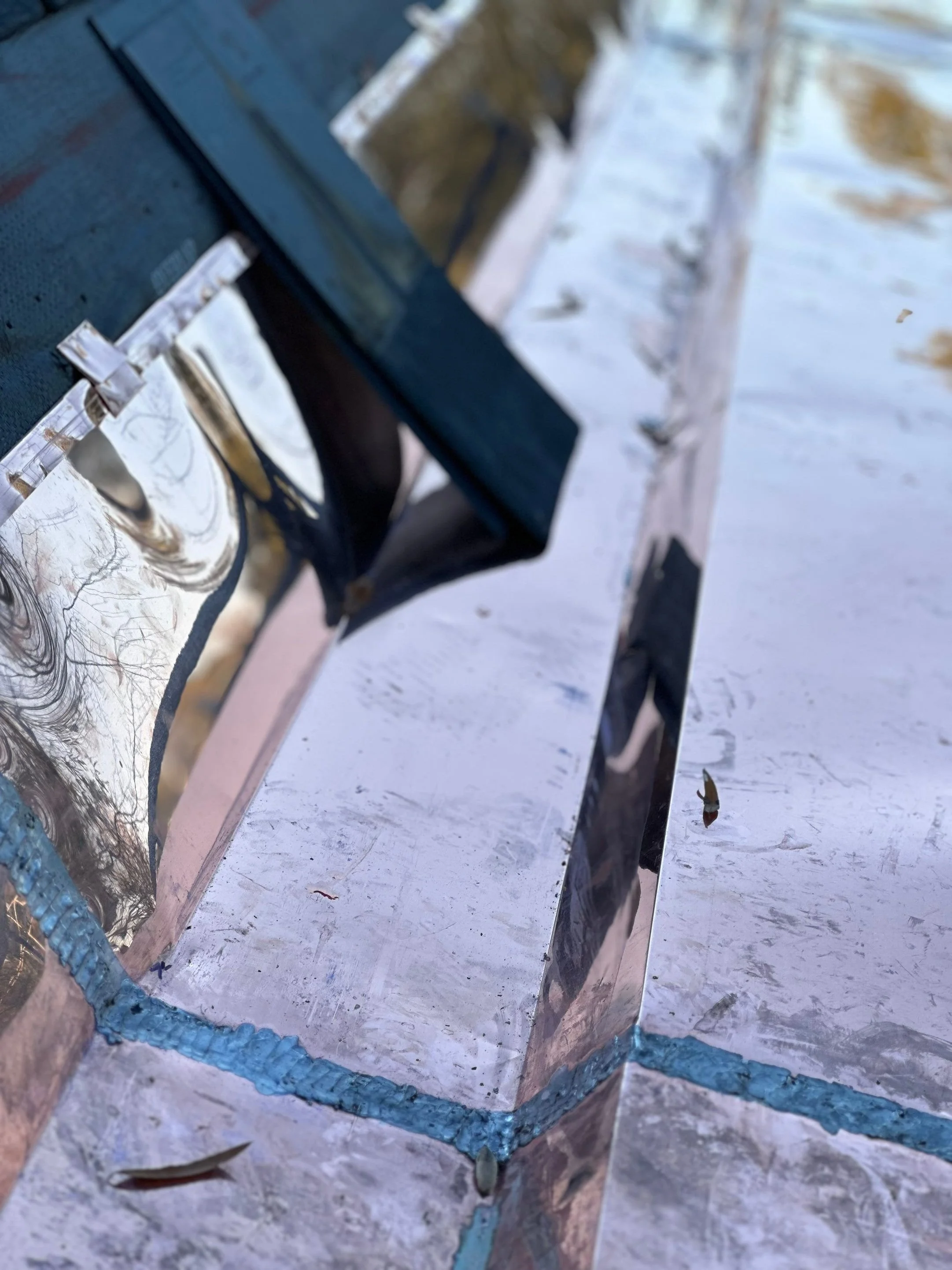 Next we measured the trough sides and calculated a slope towards the downspout at a 1/4” drop every 10’. We fabricated the copper box gutter pans on a sheet metal brake for a custom fit. Before installing the pans, we pre-tinned the back of the pans with solder so we could sweat the solder in-between the copper pans.