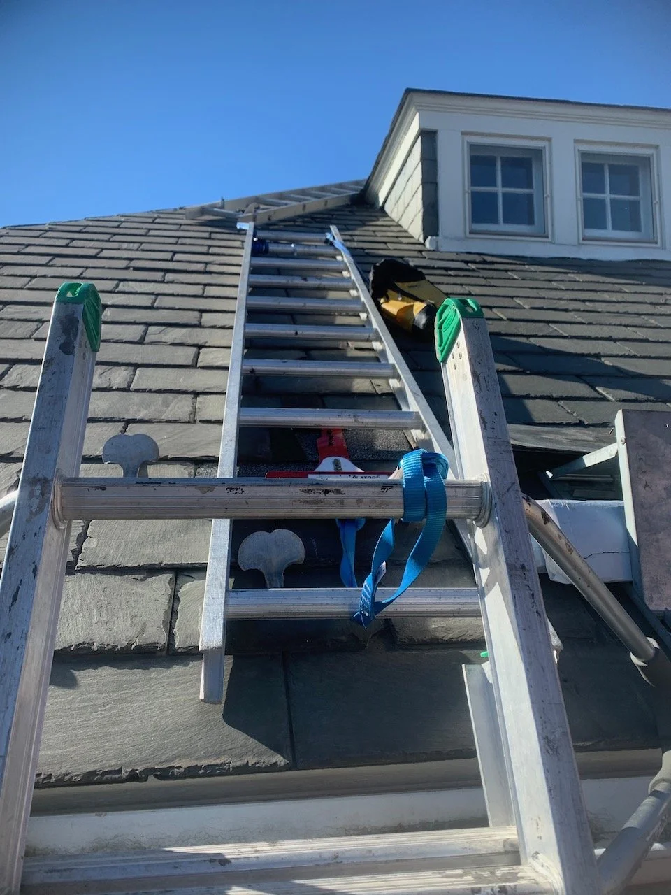 We use ladders and foam cushions to disperse our weight. This prevents the slate from cracking or breaking while we work.