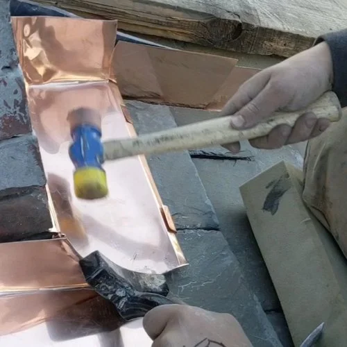 Instead of caulking or soldering, which splits metal during temperature fluctuations, we fold sheet metal, allowing for flexibility during expansion and contraction so the flashing lasts for decades.